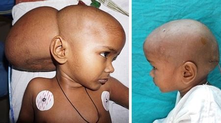 أصيبت هذه الطفلة الهندية، البالغة من العمر 4 سنوات، منذ ولادتها بورم نادر للغاية، نما في مؤخرة رأسها، وأصبح بحجم كرة القدم، ولم تتمكن من معالجته بسبب فقر عائلتها، وكان من الممكن أن ينفجر في أي لحظة ويودي بحياتها.