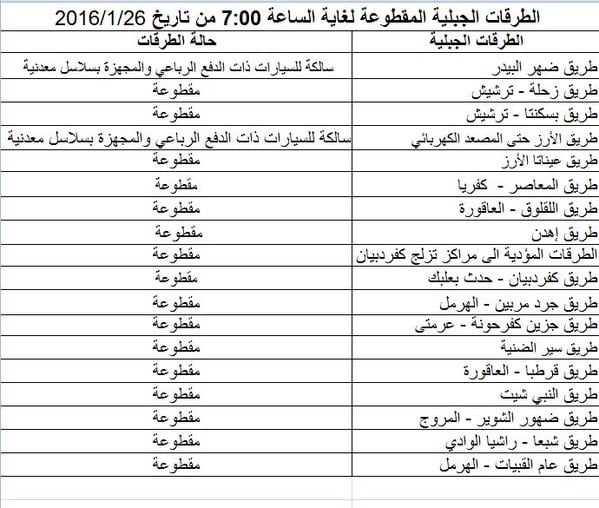 نشرت المديرية العامة لقوى الامن الداخلي عبر حسابها على موقع "تويتر"، لائحة بالطرقات المقطوعة نتيجة العاصفة التي تضرب لبنان. وأعلنت ان طريق ضهر البيدر سالكة لسيارات الدفع الرباعي والمجهزة بسلاسل معدنية فيما طريق ترشيش زحلة مقطوعة بسبب الثلوج.