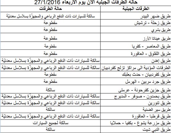 أما طريق ضهر البيدر فسالكة لسيارات الدفع الرباعي والمجهزة بسلاسل معدنية. وكذلك بالنسبة الى طريق اهدن، وطريق تنورين.