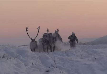 نشرت وزارة الدفاع الروسية شريط فيديو يظهر جنودا من لواء المشاة الآلية التابع لأسطول الشمال الروسي يتدربون برفقة كلاب هاسكي ورنة في ظروف قطبية قاسية.