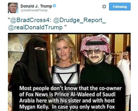 وقام ترامب بنشر صورة على موقع تويتر تزعم ظهور الأمير الوليد، شقيقته ومذيعة الأخبار في محطة فوكس نيوز، ميغين كيلي. وأشار النص الكتابي الذي تم وضعه على الصورة إلى أن الوليد كان مالكاً شريكاً في المحطة.