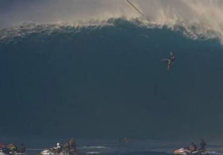 تمكن أحد راكبي الأمواج من البقاء على قيد الحياة بعد أن قفز وسط موجة كبيرة على علو 12 مترا.