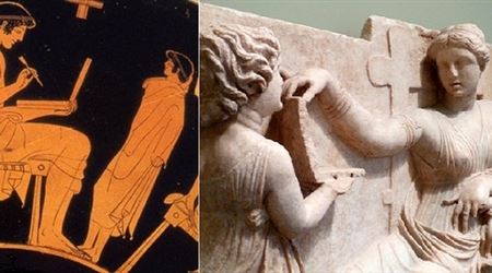 هذا التمثال الإغريقي المعروف أثرياً باسم Oracle of Delphi هو شاهد قبر جنائزي الطراز وقديم جداً، عمره أكثر من 2100 عام، لكن موحياته عصرية بامتياز، فمن يلقي عليه أول نظرة سريعة، قد يرى أن الخادمة البادية كطفلة في الجدارية تعرض على سيدتها لوحاً يشبه "لابتوب" مزوداً بمثقبين، كأي "لابتوب" معروض في محلات القرن الواحد والعشرين.