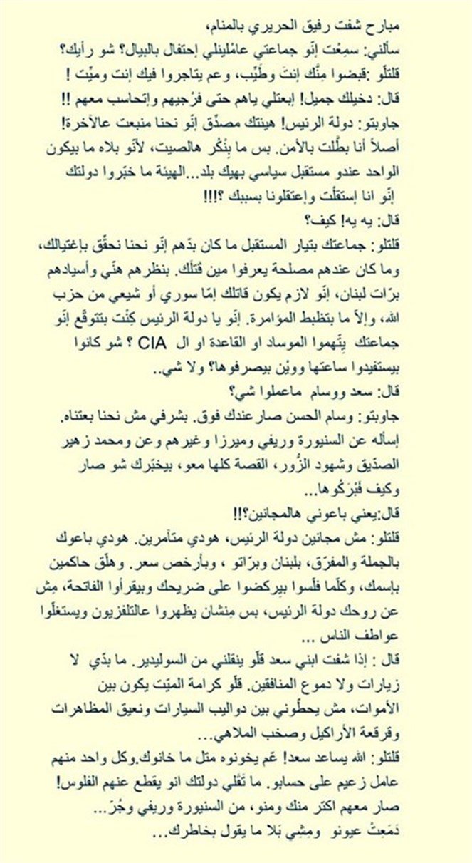مبارح شفت رفيق الحريري بالمنام، سألني: سمعت انو جماعتي عاملينلي احتفال بالبيال؟ شو رأيك