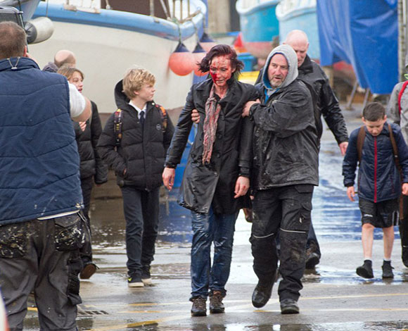 وشاهد الواقعة 4 متطوعين من مؤسسة قارب النجاة الوطنية الملكية وسرعان ما بادروا على الفور بتقديم يد العون للزوجين المتضررين جراء ما لحق بهما. وعثر على المرأة وهي في حالة من الدوار والارتباك، بالعديد من الاصابات في الرأس وكسر في ذراعها.