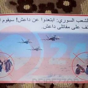 أضاف المصدر أن "التحالف الدولي – العربي كتب عبارات على المنشورات "انقلوا عوائلكم لمكان آمن التحالف قادم لمحاربة "داعش"(تنظيم الدولة الإسلامية)، أيها المدنيون ابتعدوا عن المناطق التي يتواجد فيها "داعش"، التحالف يقاتل من أجل سلامة وأمن الشعب السوري، انتباه أيها الشعب السوري ابتعدوا عن ‹داعش›، سيقوم التحالف بإسقاط قذائف على مقاتلي "داعش".
