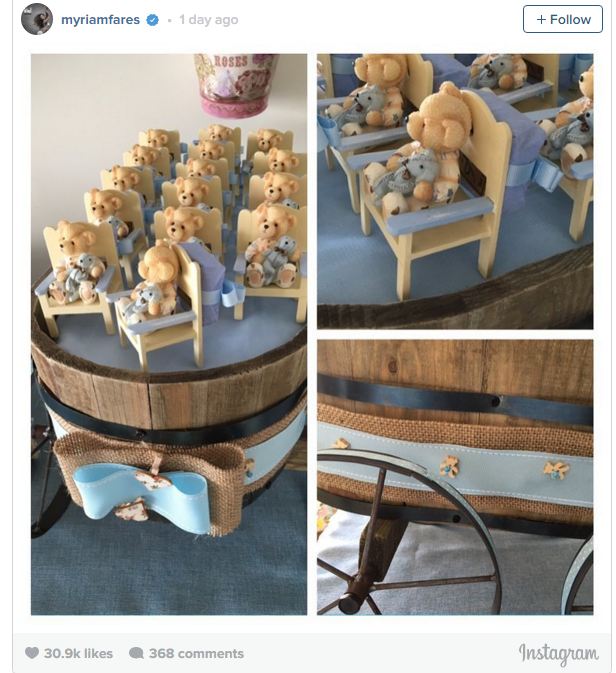 ميريام فارس شاركت جمهورها بصور للهدايا التذكارية التي ستعطيها لأصدقائها الذين سيأتون لزيارتها، وبالطبع كل الهدايا كانت باللون الأزرق لأن مولودها ذكر، وتميزت بالرقة والجمال بين دباديب صغيرة، وعربات للطفل وغيرها من الأشكال.