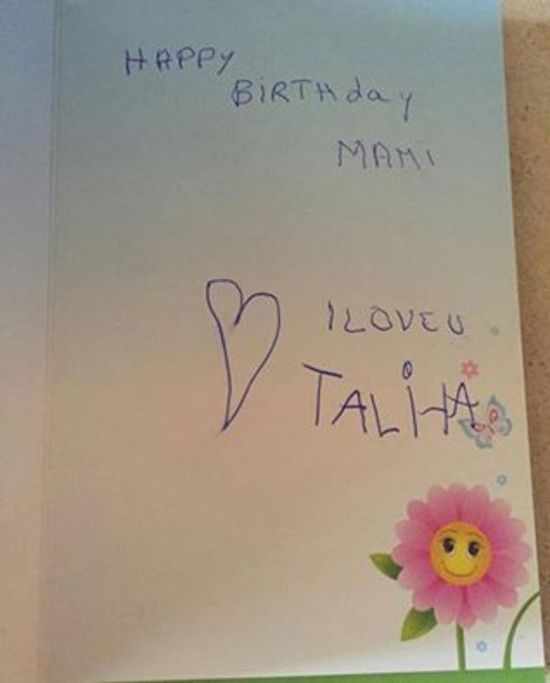 نشرت النجمة سيرين عبد النور صورة المعايدة التي تلقتها من ابنتها تاليا، لمناسبة عيد ميلادها. اذ كتبت تاليا:"عيد ميلاد سعيد "ماما" أحبك.. تاليا".