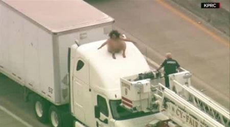 وبطريقة ما تسلقت السيدة على الشاحنة، وبقيت هناك لأكثر من ساعتين، فيما كانت فرق الانقاذ تحاول معرفة كيفية إنزالها دون أن تتسبب في وقوعها وإصابتها.
