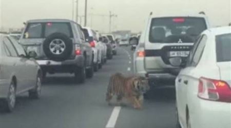 أثار نمر طليق في شوارع الدوحة العاصمة القطرية، ذعر مستعملي الطريق الذين فوجئوا بالحيوان المفترس بينهم على الطريق حراً طليقاً.
