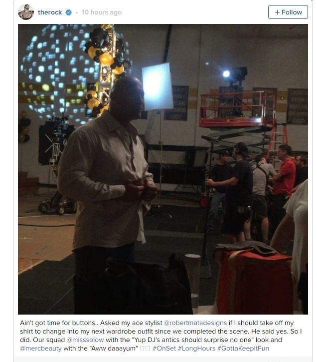 وشارك "ذا روك" جمهوره عبر Instagram فيديو طريف له بين تصويره لمشهد والآخر، وهو يقوم بفك أزرار قميصه، ما تسبب في وقوعها على الأرض جميعا، وبرر هذا بأنه ليس لديه الوقت لخلع قميصه بصورة مرتبة مثل غالبية الناس.