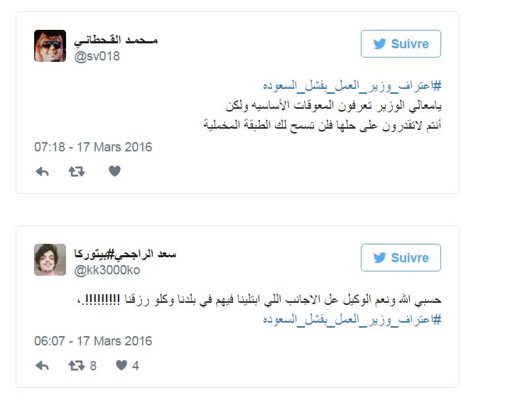 واجتاح هاشتاغ "اعتراف_وزير_العمل_بفشل_السعودة" موقع التواصل الاجتماعي "تويتر" حيث وضع الاعتراف الإصبع على الجرح لينفجر سيل من التساؤلات تراوحت بين السخرية والاستنكار، فيما وجه العديد رسائل لوزير العمل مطالبين بإيجاد حل سريع للمسألة وليس فقط الاعتراف بالفشل.