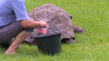 حظيت سلحفاة تعتبر أقدم حيوان لا يزال على قيد الحياة بأول حمّام لها على الإطلاق، استعداداً للزيارة المرتقبة لأحد أفراد العائلة المالكة في بريطانيا.