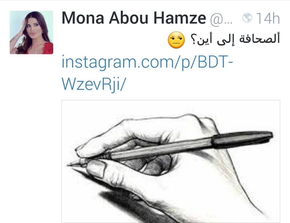 عبرت الإعلامية منى أبو حمزة عن سخطها من الوضع المذري التي وصلت اليه الصحافة الورقية و الذي سيؤدي الى إغلاق العديد من الصحف العريقة في لبنان. و نشرت على موقها "تويتر" صورة يد تحمل قلما و علقت عليها: " الصحافة الى أين؟" لتطلق من بعدها تغريدة ثانية متسائلة: الم يكن أجدر بالدولة مد وزارة الإعلام بميزانية خاصة لدعم المؤسسات الصحافية العريقة في تخطي الوضع الإقتصادي الراهن؟ #سياسة_الطمر