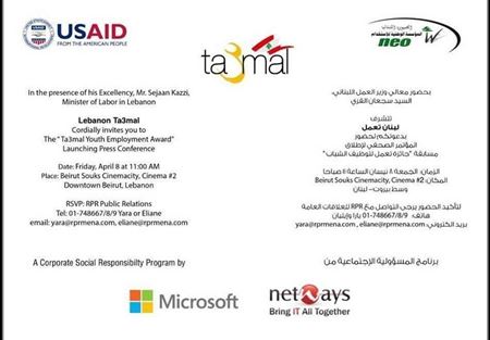 "ليبانون تعمل"، مبادرة المسؤولية الاجتماعية من Microsoft، المموّلة في لبنان من الوكالة الأمريكية للتنمية USAID وشركةNetways ، بالتعاون مع المؤسسة الوطنية للاستخدام (NEO) ووزارة العمل اللبنانية، سوف تعقد مؤتمراً صحفياً ، بحضور معالي وزير العمل السيد سجعان قزي فضلا عن ممثلي مختلف الجامعات، والمنظمات غير الحكومية ووسائل الإعلام .