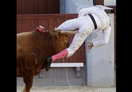 نجا مصارع الثيران البيروفي أندريس روكا راي، من إصابة مميته بعد قيام ثور هائج بغرس قرنه الحاد في مؤخرته خلال مصارعة للثيران حضرها ملك إسبانيا.