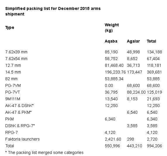 وشملت البضائع الواردة في الوثيقة بنادقAK-47، ورشاشات PKM، والرشاشات الثقيلة DShK، بالإضافة إلى قاذفات صواريخ RPG-7، وأنظمة "K111M Faktoria9" المضادة للدبابات.