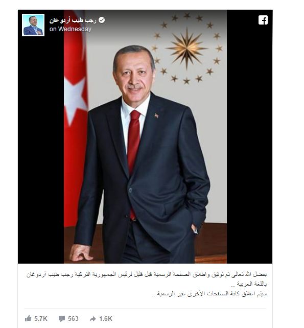 وقالت الصفحة في أول منشور لها، "بفضل الله تعالى تم توثيق وإطلاق الصفحة الرسمية قبل قليل لرئيس الجمهورية التركية رجب طيب أردوغان باللغة العربية.. سيتم إغلاق كل الصفحات الأخرى غير الرسمية".