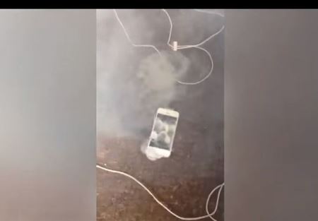وقد بدأ الشاب بتحطيم هاتفه النقال عبر توجه العديد من الضربات القوية إليه بمطرقة معدنية حيث تحطمت شاشة الهاتف بالكامل. وبعد الضربة السادسة، انفجر الهاتف وانبعث منه دخان أبيض كثيف. ولم تمض سوى ثوان قليلة حتى امتلأت الغرفة بالدخان الأبيض.