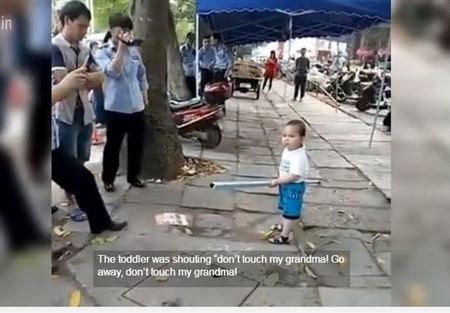 في مشهد طريف، أظهر مقطع فيديو تداولته مواقع التواصل الاجتماعي طفلاً صغيراً وهو يدافع عن جدته بكل شجاعة في أحد الشوارع الصينية.