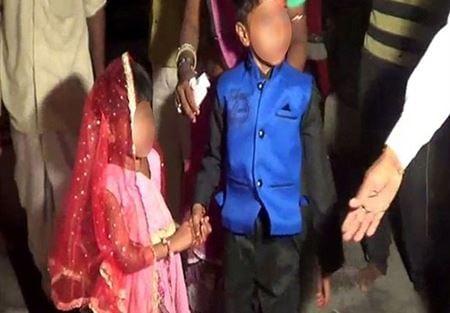 وظهرت فتاة تبلغ من العمر 5 أعوام وهي ترتدي فستان عروس هندوسيا ويتم اجبارها على السير حول النار رفقة عريسها، ذلك الصبي الذي يبلغ من العمر 11 عاما.