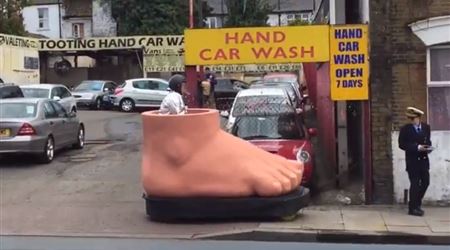 في مشهد طريف ومبتكر، أظهر تسجيل مصور قصير نشر على مواقع التواصل الاجتماعي، رجلاً يرتدي زياً خاصاً وهو يقود سيارة على شكل قدم ضخمة في أحد شوارع العاصمة البريطانية لندن.