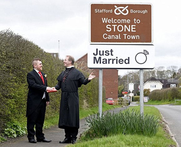 ونقلت صحيفة الدايلي ميل البريطانية عن أليكس، الذي يعمل كمدير لأحد محلات البيتزا، قوله : لدى ارتباط بتلك البلدة التاريخية وحصلت على مباركة رسمية على ذلك برئاسة القس جون تاونسند. ولفتت الصحيفة إلى أن أليكس تحضر لعقد القران بارتداء البدلة الرسمية لحضور الحفل عند العلامة المدون عليها أهلا بكم في ستون.