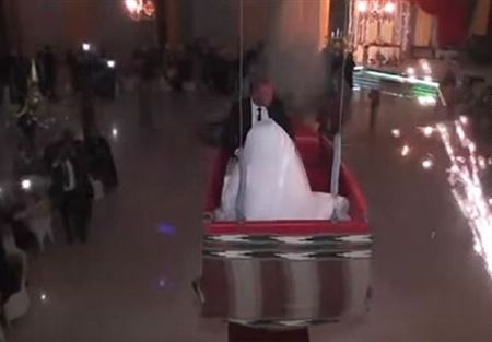 تداولت مواقع التواصل الاجتماعي مقطع مصورا لحادثة سقوط عروسين من فوق قارب طائر داخل أحدي القاعات ، وذلك بعد خلل فني أصاب الرافعة التي كانت تحملهم .