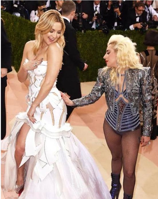 يبدو أن الليدي غاغا أعجبت بإطلالة كيت هادسون في الحفل وفستانها الشفاف لتبدي إعجابها بوضع يدها على مؤخرة صديقتها.
