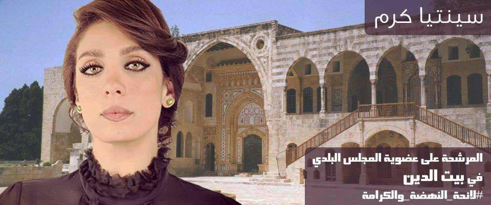 أعلنت الفنانة سينتيا كرم عن ترشّحها لعضوية المجلس البلدي في بيت الدين، ضمن لائحة "النهضة والكرامة"، لافتة الى أن الهدف الأساسي هو زرع أمل جديد من خلال بلدية جديدة، تعمل على إعادة إحياء بيت الدين على جميع الصعد، عبر مشاريع إنمائية تتضمن دعم المراكز الصحية ومركز الصليب الأحمر، إضافة الى دعوة الأهالي للعودة وعدم اقتصار زيارتهم لبيت الدين على فترة المهرجانات فقط.
