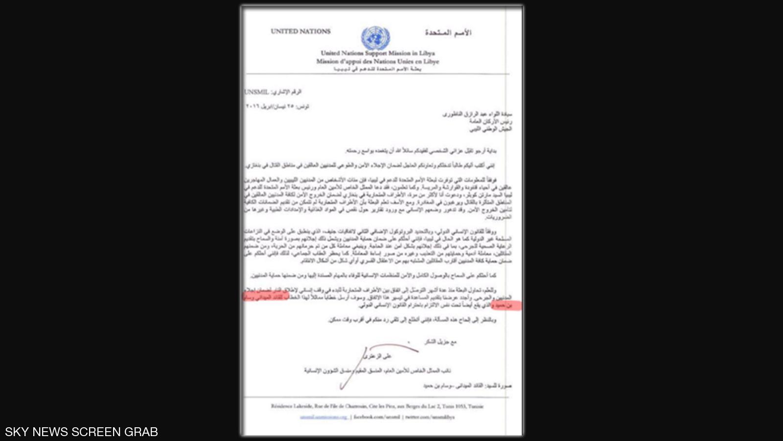 والرسالة موجهة من علي الزعتري، نائب الممثل الخاص للأمم المتحدة، إلى رئيس أركان الجيش الوطني الليبي اللواء عبد الرزاق الناطوري يطلب منه فيها التعاون لإجلاء "المدنيين الليبيين والعمال المهاجرين" من بؤر سيطرة داعش وغيرها من جماعات الإرهاب في مدينة بنغازي.