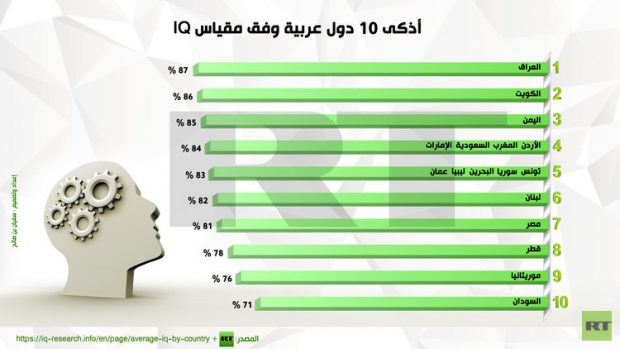 نشر موقع "روسيا اليوم" على صفحته، إنفوجراف يعرض أكثر 10 دول عربية ذكاءًا من خلال مقياس الـIQ العالمي، وأشار الموقع إلى أن ترتيب الدول في هذا الإنفوجراف هو مفاجئًا للبعض.