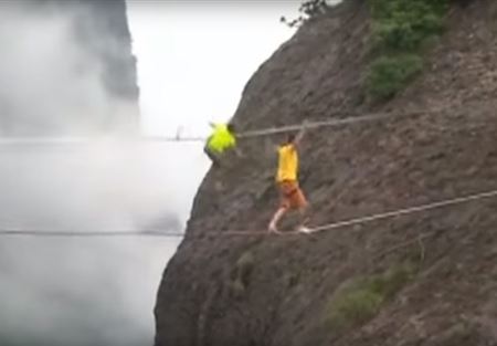ولم تخل البطولة من مشاهد مخيفة، فقد كاد أحد المتسابقين أن يسقط من الارتفاع الشاهق حين تعثر على الحبل، لكنه تدارك الأمر سريعا وتشبث بالحبل.