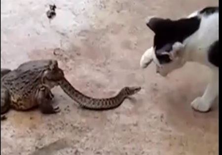 كشف شريط فيديو من تايلاند عن واحدة من أغرب المعارك، حين أمسك ضفدع عملاق بثعبان صغير من ذيله، فيما حاولت قطة مهاجمة الثعبان، وهي لا تدري ماذا يحدث؟