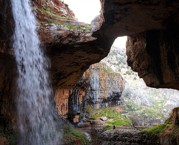 تظهر الصور التالية شلالا ثلاثي الطبقات في شمال لبنان فيما تتدفق المياه منه عبر صخور دائرية الشكل.