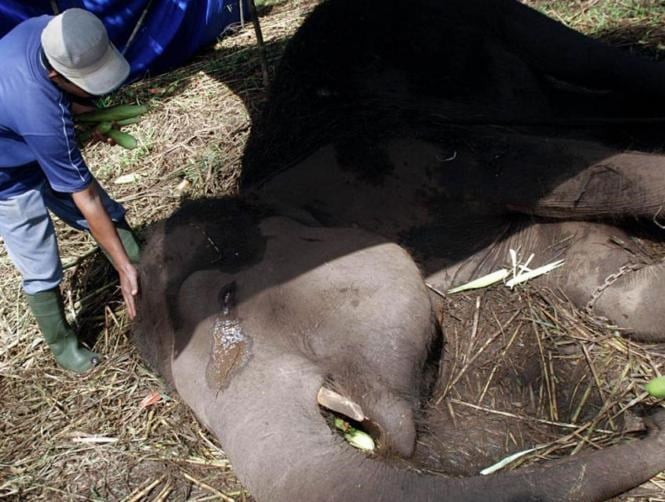 نشرت صور مفجعة تظهر أنثى الفيل وهي تبكي، عندما كانت تحتضر على أرض حديقة حيوانات بإندونيسيا .