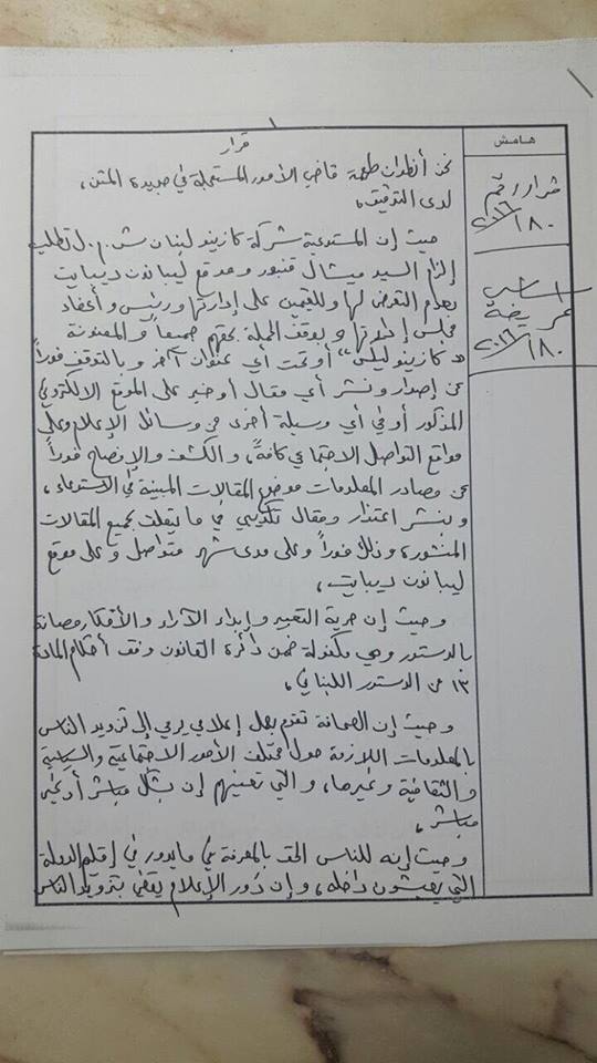 "ليبانون ديبايت" الذي أكد في السابق إصراره على الإستمرار في نشر مواضيع الفساد في الكازينو ذات الصلة، يرى نفسه اليوم مسؤولاً بشكلٍ أكبر عن تحقيق ما وعد به. وبينما نرى أن خطوة قاضي الأمور المستعجلة في جديدة المتن هي دليل عافية على الجسم القضائي، نرى أن هذه العافية يجب أن تنسحب على شتى المواضيع المرتبطة بقضايا مماثلة، وفي حين أن إدارة الكازينو تلجأ إلى تحريف وقائع القضايا المطروحة على "ليبانون ديبايت" وأخذها شخصيةً أملاً منها بكبح الموقع عن نشرها عبر القضاء، تثبت الوقائع أن لا طريق للحق سوى الحقيقة التي ستجد لها الإطار المناسب للمرور عبره نحو هدفها.