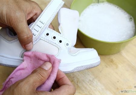 قم بخلط البكينغ صودا والخل الابيض، حتى تحصل على مزيج رغوي، ثم ضع هذا الخليط على الحذاء، باستخدام الفرشاة، اتركه لـ 30 دقيقة ثم اغسله بماء بارد.