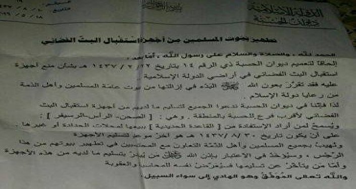 أصدر تنظيم داعش أوامر للمدنيين في المناطق التي يسيطر عليها بتسليم أطباق الدش وأجهزة استقبال القنوات الفضائية "الريسيفر" وتدميرها.