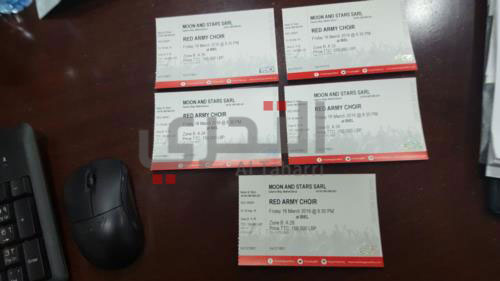 ورد إلى موقع التحري شكاوى من عدد كبير من الأشخاص الذين قاموا بشراء بطاقات لحضور عرض ال Red Army Choir المنظم من قبل شركة Moon and Stars وكان من المقرر ان يقام في مجمع البيال في 18 آذار وقد بلغ سعر البطاقة 100 دولار أميركي،ولكن المفاجأة كانت عندما الغي الحفل وضاعت معه الاموال المنفقة على شراء البطاقات ،فمن يعوض على المستهلكين الذين ومنذ الثلاثة اشهر يتلقون وعودا من قبل منظمي الحفل باعادة اموالهم ولكنهم لم يحصلوا على شيء حتى تاريخ اليوم ز