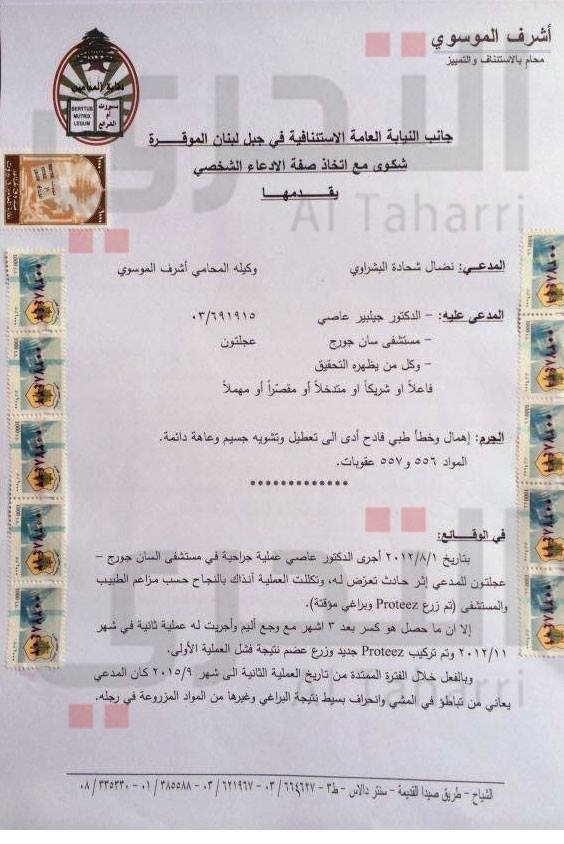 ادعى المحامي العام الاستئنافي في جبل لبنان القاضي داني شرابية على الطبيب جيليبير عاصي بعد ثبوت الخطأ الطبي بمواد تصل عقوبتها الى ٣سنوات وإحالة الدعوى امام قاضي التحقيق لمباشرة التحقيقات وإصدار كل مذكرة يقتضيها التحقيق.