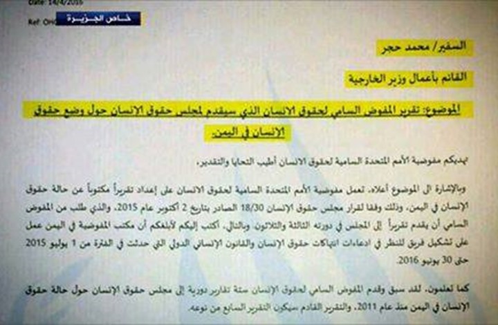 وتشير المذكرة الصادرة عن مكتب المفوض السامي لحقوق الإنسان في صنعاء، إلى مخاطبة السفير محمد حجر، وهو قيادي حوثي، كقائم بأعمال وزير خارجية اليمن.