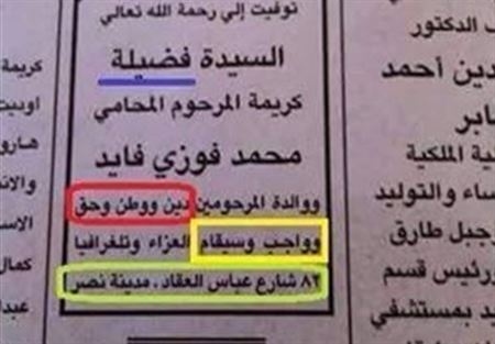 "البقاء لله، توفيت إلى رحمة الله تعالى السيدة فضيلة كريمة المحامي الراحل محمد فوزير فايد، والدة المرحومين دين ووطن وحق وواجب وسيقام العزاء في 82 شارع عباس العقاد ـ مدينة نصر".