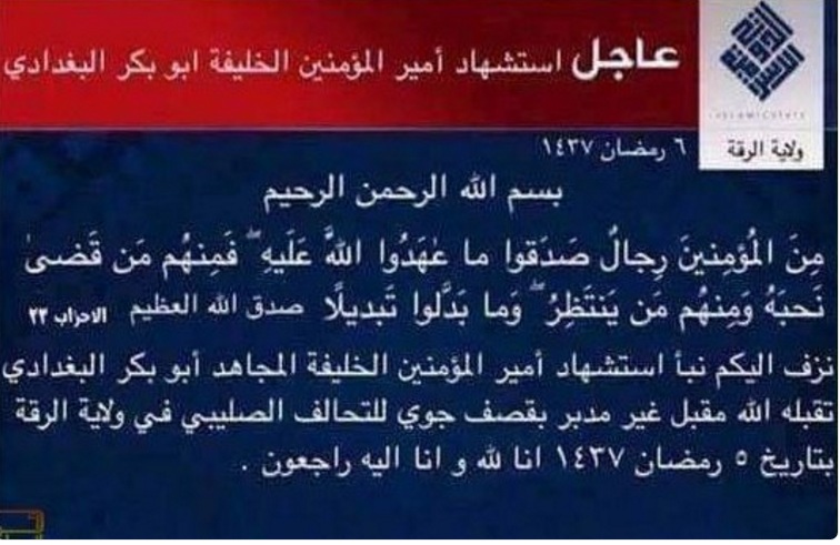 من جهتها, أصدرت "ولاية الرقة" بياناً نعت فيه البغدادي الذي قتل بغارة للتحالف الدولي على مدينة الرقة المعقل الابرز لداعش.