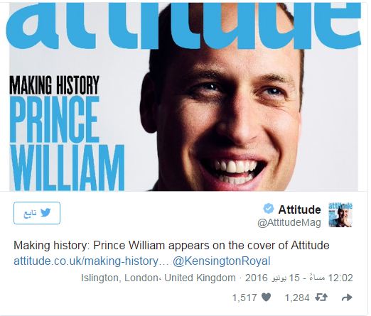 أعلنت مجلة أتيتيود الأربعاء 15 حزيران أن صورة الأمير وليام ستظهر على غلاف عدد المجلة لشهر تموز، متحدثا ضد "فوبيا" المثليين.