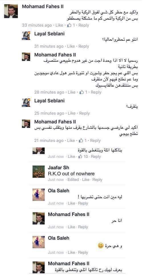 من ثم أضافت بعد جدال حاد دار بينها وبين الطالب ورواد مواقع التواصل الاجتماعي "وردني "توضيح" (؟!) من ألطالب اللي بدو يضرب البنت اللي بتجي مفرعة عَل جامعة اللبنانية. قال هو ما قال بيضربها اذا إجت مفرعة قال بيضربها اذا إجت " من غير هدوم "
