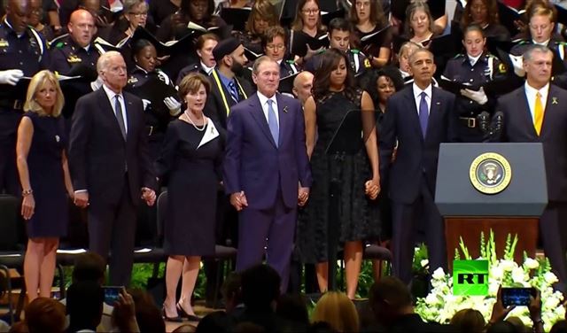 هذا وأثناء قيام جورج بوش وعدد من السياسيين بأداء أغنية حدادا على أرواح رجال الشرطة، بدأ الرئيس الأمريكي السابق بالترنح يمينا وشمالا كأنه رجل ثمل يرقص في حانة.
