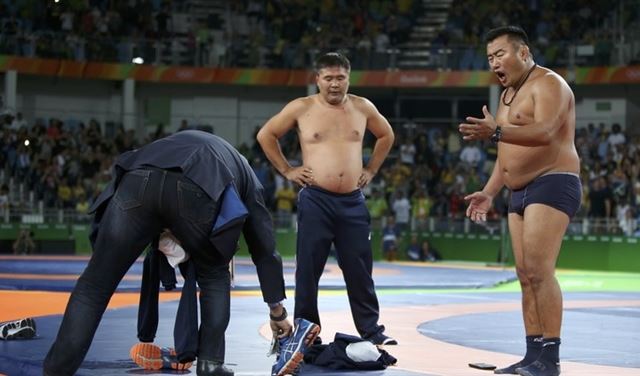 وقام مدربا اللاعب المنغولي بالصعود إلى حلبة المصارعة وخلع ملابسهما وأحذيتهما أمام الكاميرات والمشاهدين احتجاجا على إعطاء لجنة التحكيم نقطة التعادل للخصم الأوزبكي ومن ثم إضافة نقطة جديدة للأخير ليصبح هو الفائز في النزال.