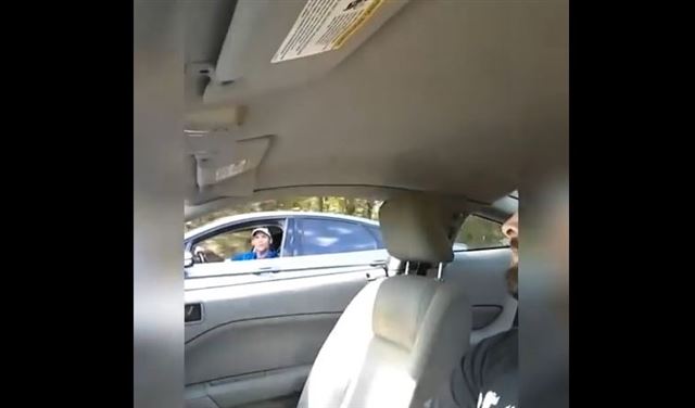 يُظهر الفيديو رجلاً يقود سيارته بمحاذاة سائقٍ آخر قبل أن ينطلق في سلسلة طويلة من السباب والشتائم المحذوفة من المقطع… ثم يضغط الفرامل عندما يرى السلاح.