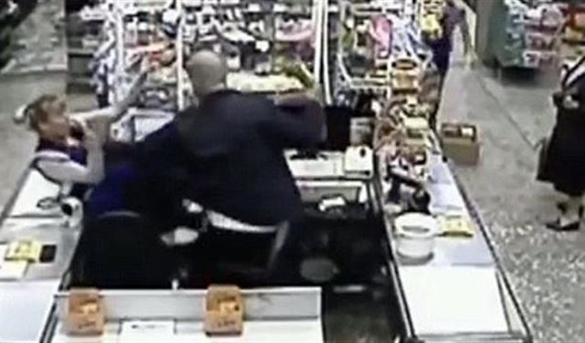 وتبدو المرأة في بداية مقطع الفيديو وهي تعمل على كاونتر محاسبة، وما إن تشاهد الرجل المتجه نحوها، تصرخ: "كوستيا، اذهب بعيداً، لا تلمسني".
